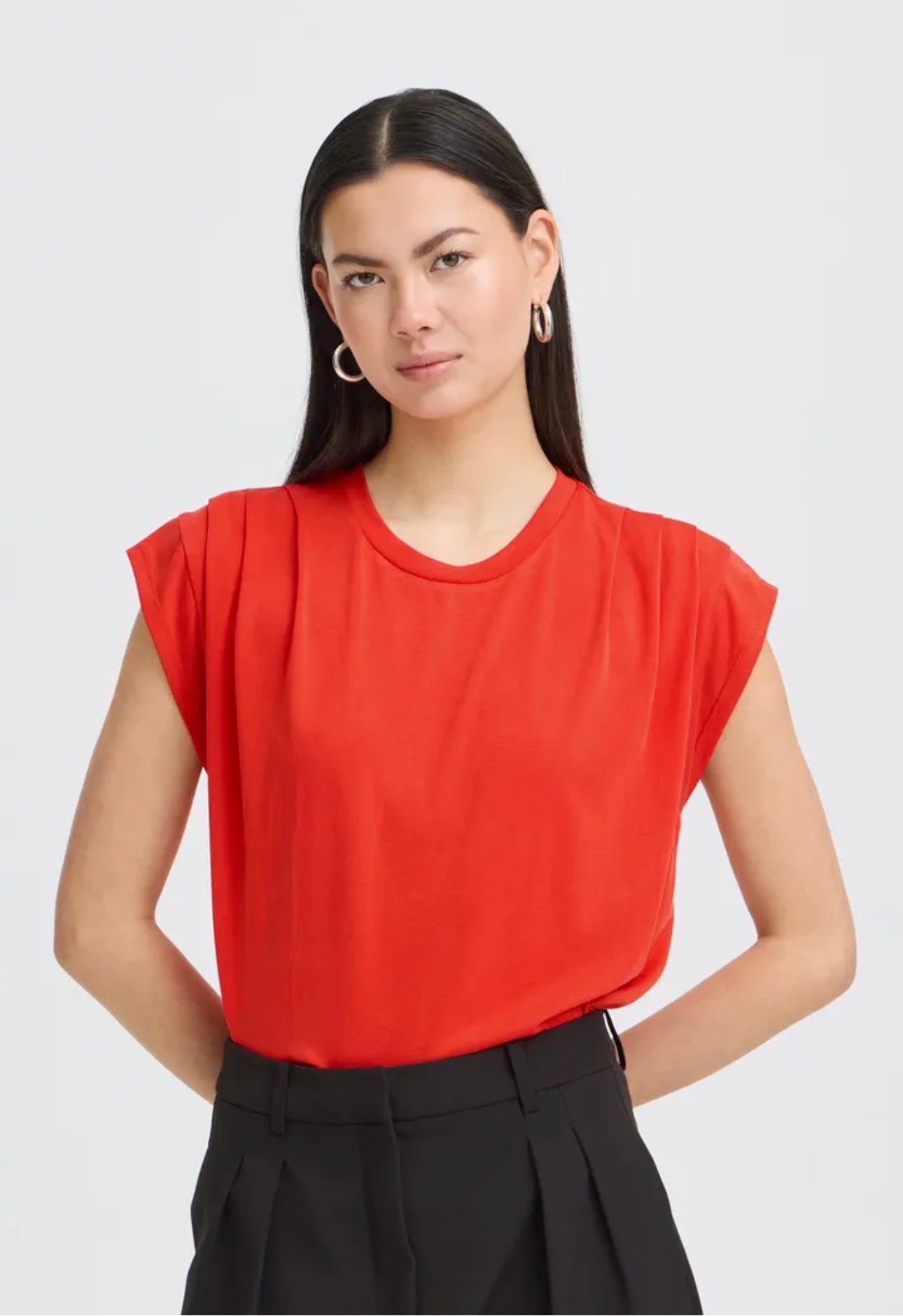 The ICHI Lisken Top 20114138 features distinctive pin tuck shoulder details, offering both a structured look and enhanced comfort. The fiery red color ensures a bold aesthetic, making it suitable for various occasions. This top combines style with practical design, suitable for layering or standalone wear.
